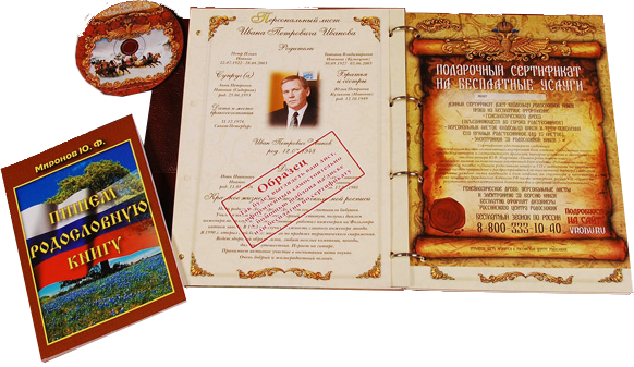 Разработанная Ю.Мироновым методика структурирования и оформления информации о родственниках на данный момент используется в большинстве генеалогических центров страны, но лишь в нашем центре, купив родословную книгу в подлиннике (оригинале), Вы получите одновременно и комплексное решение всех остальных проблем сохранения информации о Вашем роде. Порадует Вас и то, что многие услуги Вам, как обладателям Подарочного Сертификата автора, будут предоставлены абсолютно бесплатно.
