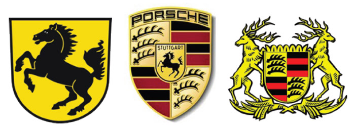 Эмблема фирмы Porsche основана на гербе германской земли Баден-Вюртемберг: красно-черные полосы и оленьи рога. В её столице — Штуттгарте — и расположена фирма. Гарцующий жеребец в центре эмблемы — герб самого Штуттгарта, напоминающий о том, что родной для марки город был основан как конная ферма в 950 году.