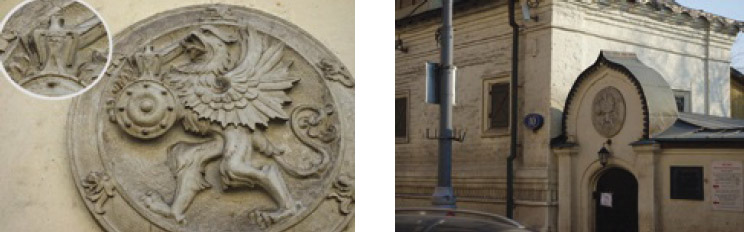 Вход украшен изображением герба дворян Романовых после 1856 г.