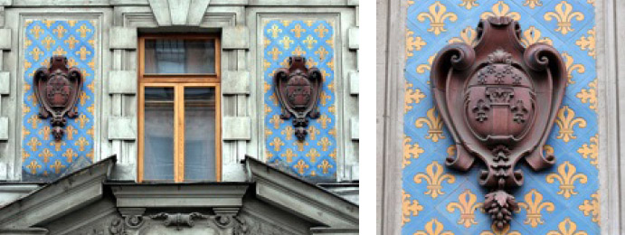 Фасад украшен самим гербом Бенуа, а также его элементами — геральдическими лилиями.