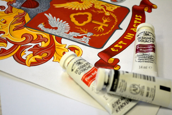 После утверждения эскиза будущим владельцем он передаётся в отрисовку художнику. В зависимости от выбранного варианта исполнения герб исполняется графическим художником в цифровом виде или традиционным художником на бумаге или холсте с использованием масла, акварели, темперы, гуаши, туши. Благодаря этому герб приобретает живописный вид. Прорисовываются мелкие детали, такие как шерсть у животных, перья у птиц и различные другие подробности.
