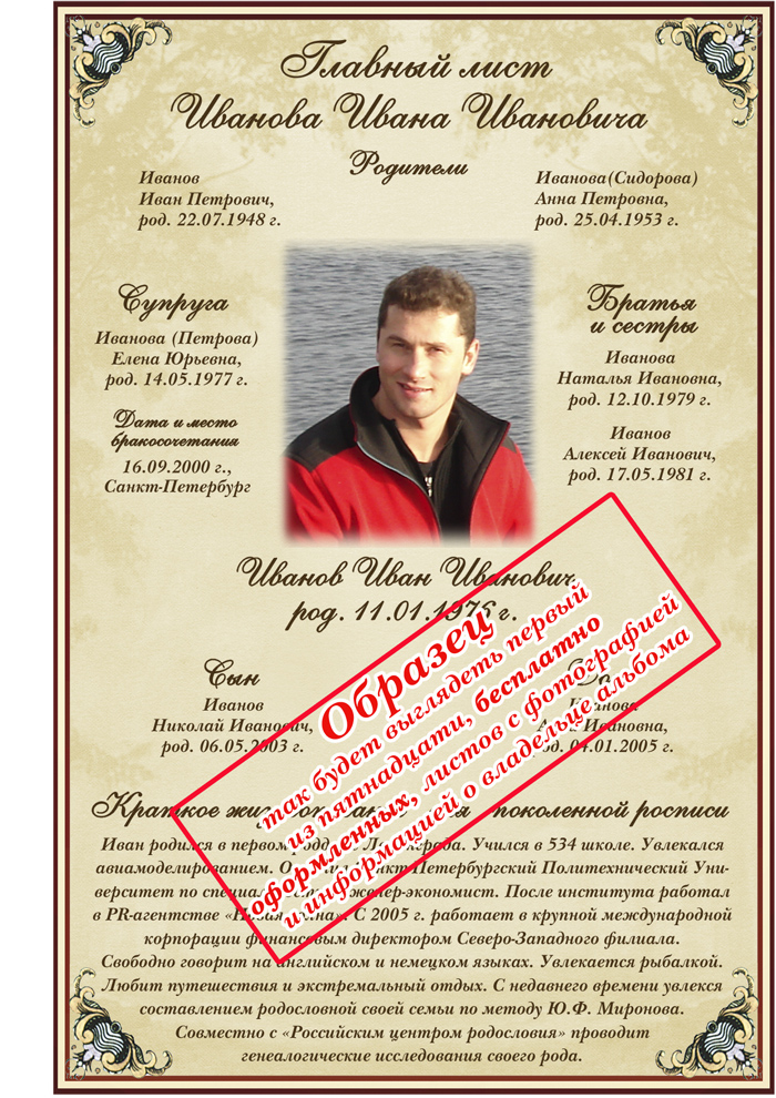 - Второй шаг. Оформить свой Главный лист и листы ближайших родственников. Для владельцев Родословной книги дизайнеры нашего Центра Родословия оформят Главные листы владельцу книги и его прямым родственникам в трех поколениях (до 15 листов) абсолютно бесплатно. Подробнее…