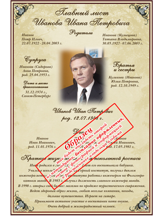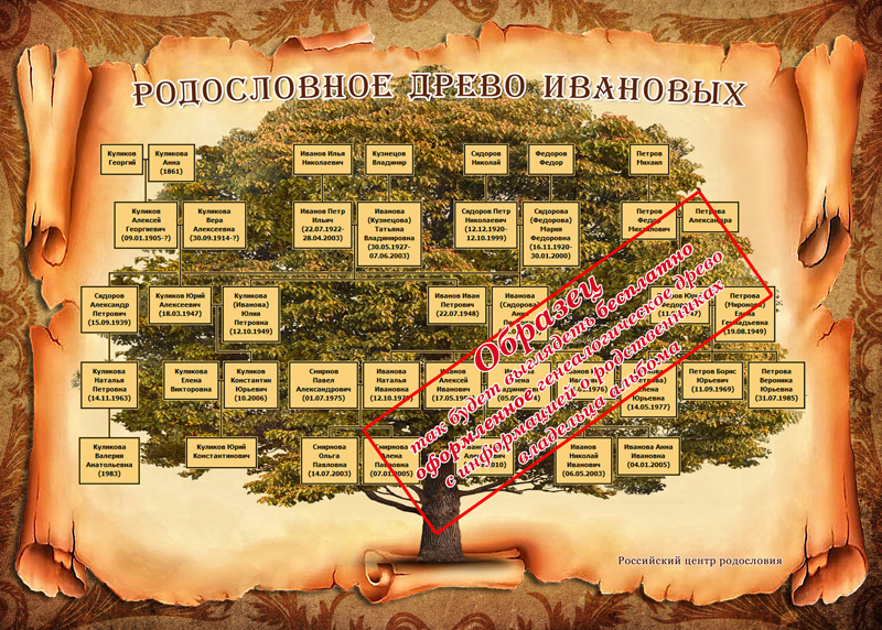 Для владельцев Родословной книги дизайнеры нашего Центра оформят генеалогическое древо до 40 персон абсолютно бесплатно. Подробнее…